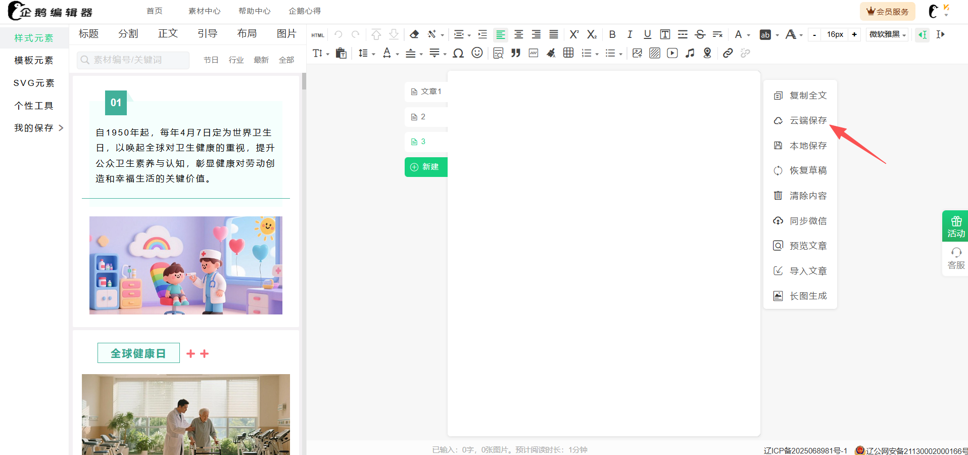 企鹅编辑器的“云端保存”功能是指把编辑的公众号文章的内容保存到云端,通过云端保存的文章可以在其他电脑登陆账号后上使用,经过云端保存的文章内容还可以使用“同步微信”功能。网址是www.qiebjq.com