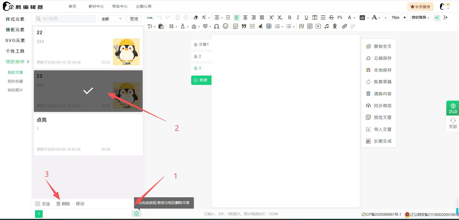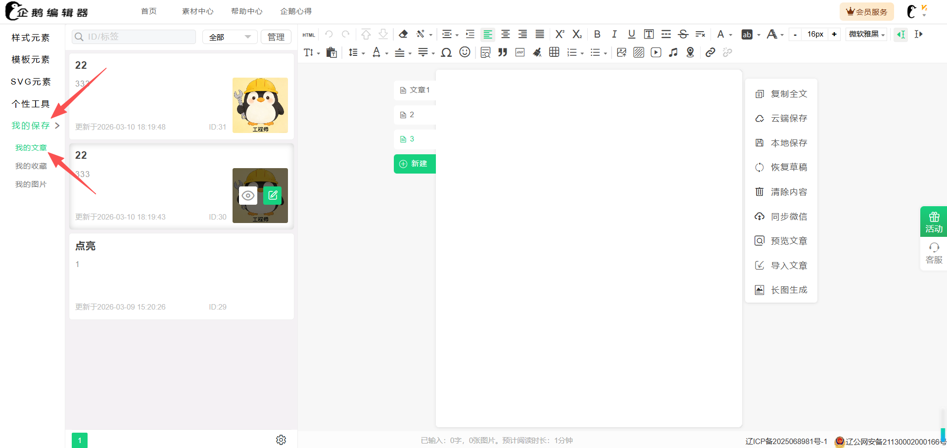 通过云端保存后的文章是可以在其他任何电脑上登陆同样的账号都可以进行编辑操作的,在左侧“我的保存”-“我的文章”就可以看到了。