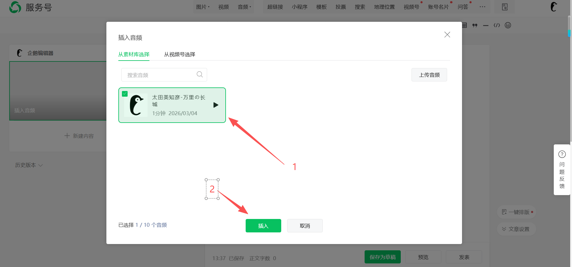 3:选择一个音频,并点击插入