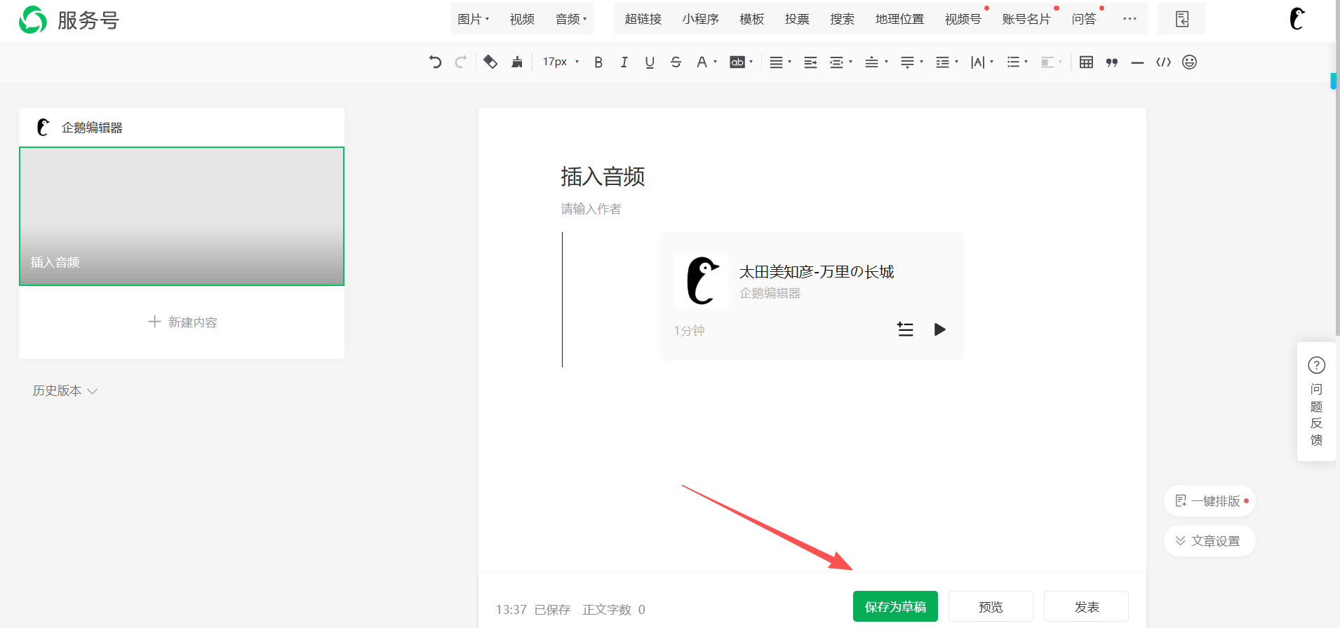 4:插入到文章后,点击保存为草稿