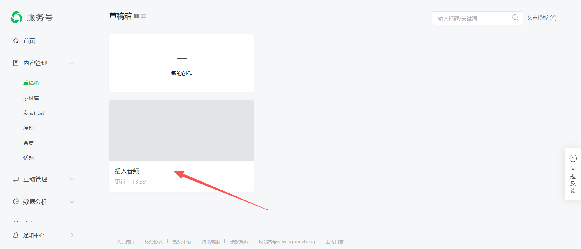 1:到公众平台官方后台页面然后点击左侧菜单下的内容管理->草稿箱,并点击新的创作->写新文章