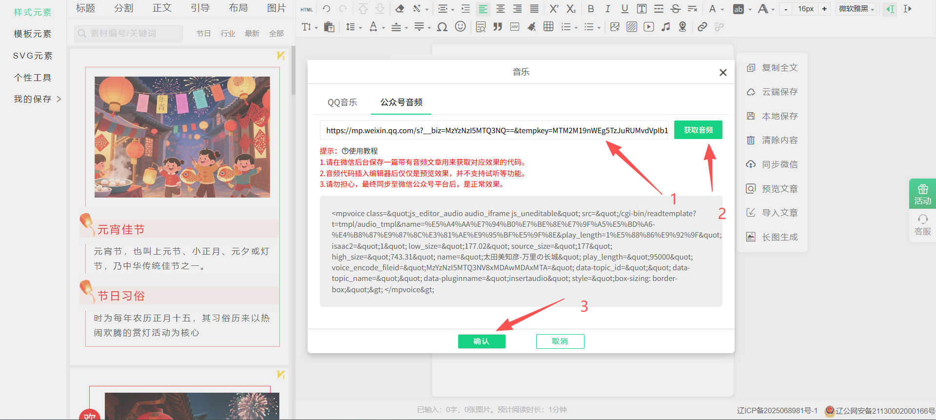 7:将复制的链接粘贴到链接文本框中,并点击获取音频。然后等待提示,如果获取成功会是下面的状态,然后点击确认即可