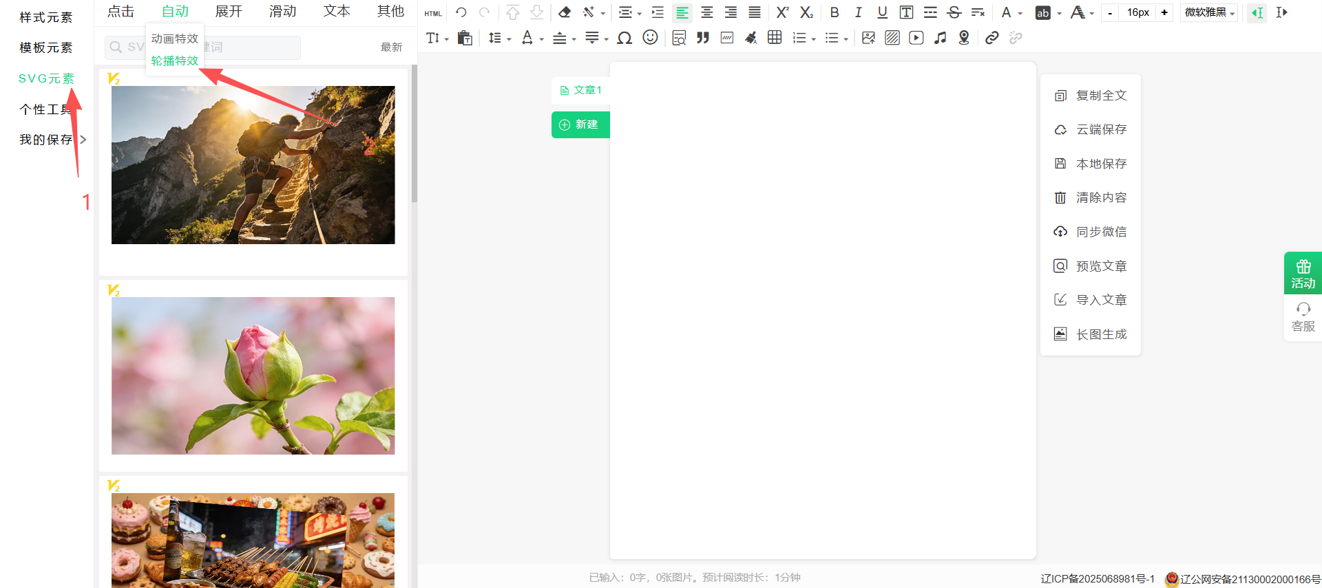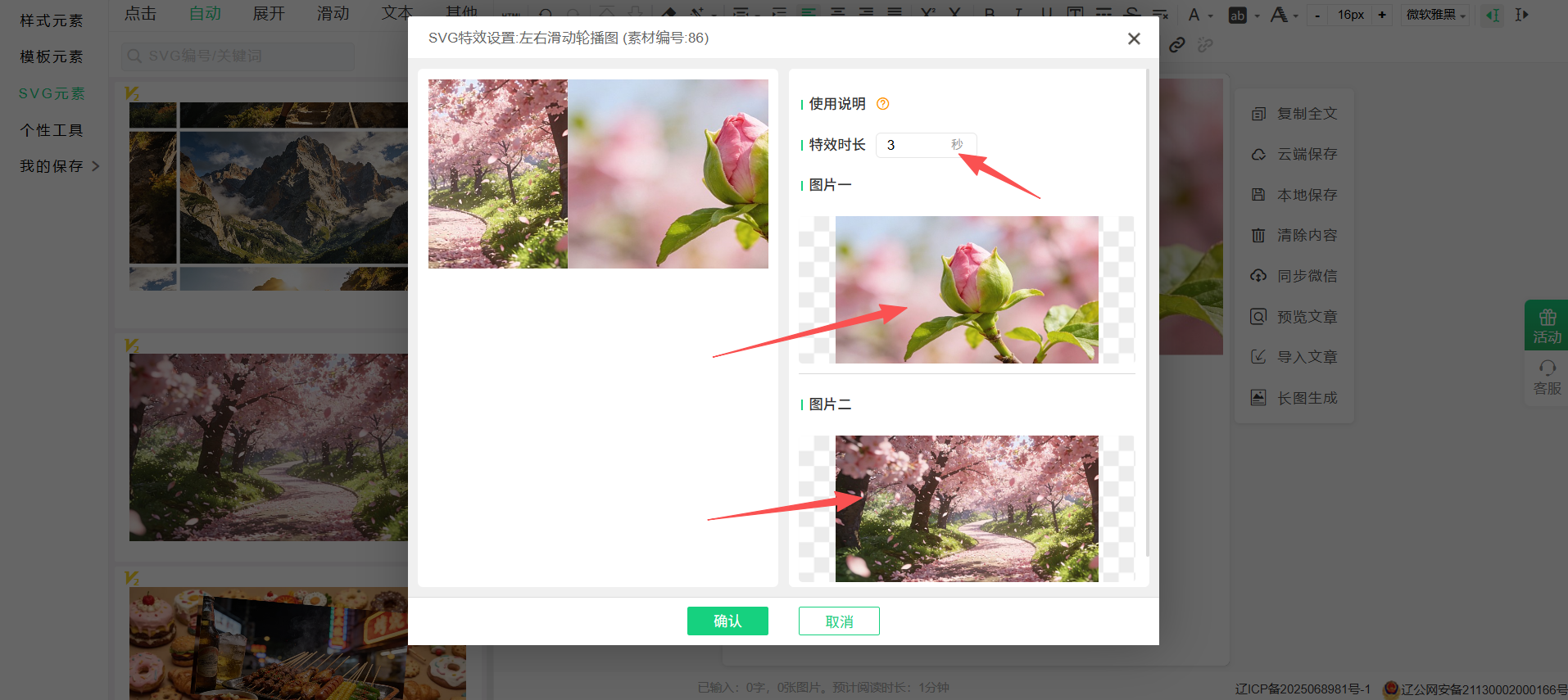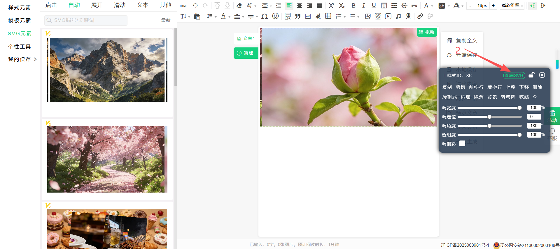 3:在编辑区中点击要编辑的轮播特效,右侧会弹出样式工具条,并点击配置svg按钮