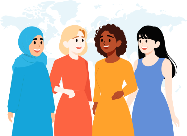 vip1商务风格世界妇女大会蓝色背景世界地图下四位不同国家的女性友好相伴模板