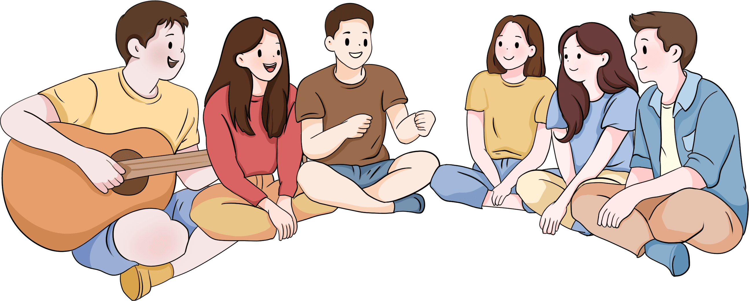 vip1简约文艺风 企业团建 小串灯花草帽子松树地图吉他 六个人坐在草地上交谈模板