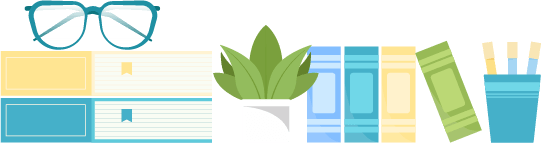 vip2文艺商务风格暑期家访白色标题色块下的书本眼镜绿植等不规则色块模板