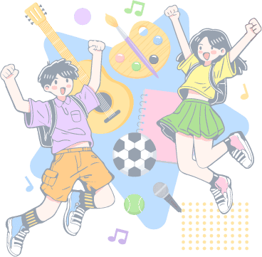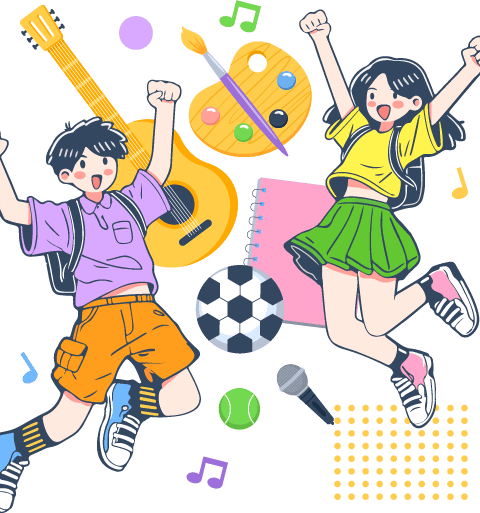 vip1卡通风格小学春季学期社团招新吉他画板画笔音乐话筒足球网球书本音符几何男孩女孩学生模板