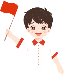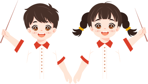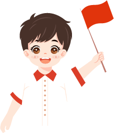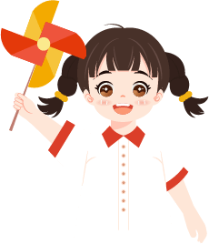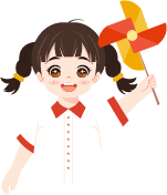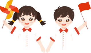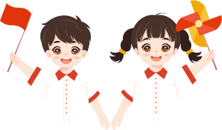 vip2卡通可爱风格节日六一儿童节红旗前的男孩女孩手拿小红旗和小风车模板