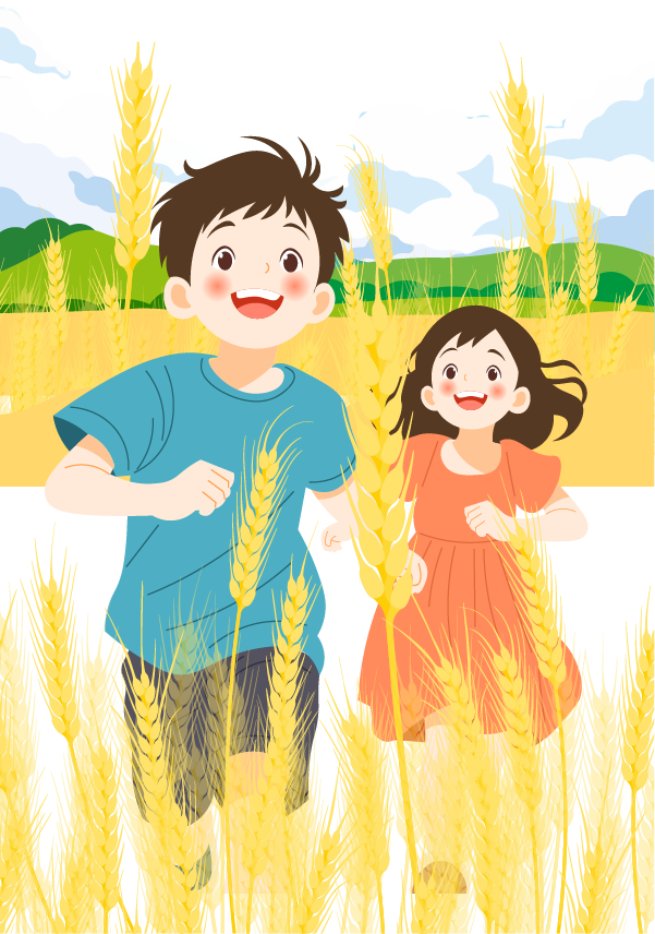 vip1文艺卡通风芒种至·盛夏始二十四节气风吹麦浪忙有所向蓝天白云麦田里小男孩和小女排在奔跑模板