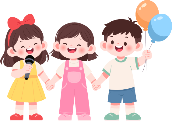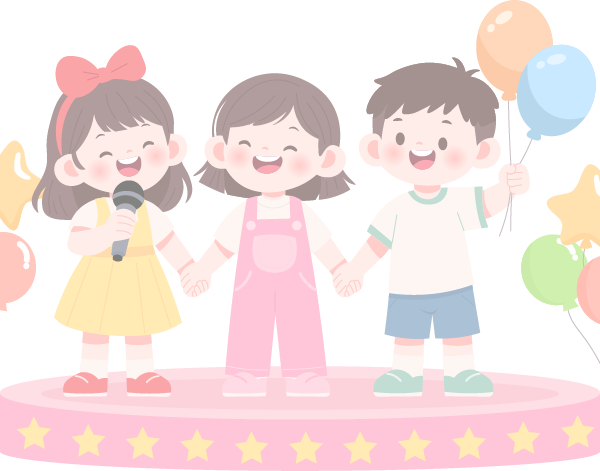 vip2卡通可爱风六一儿童节文艺汇演三个小朋友站在舞台上气球话筒小彩旗模板