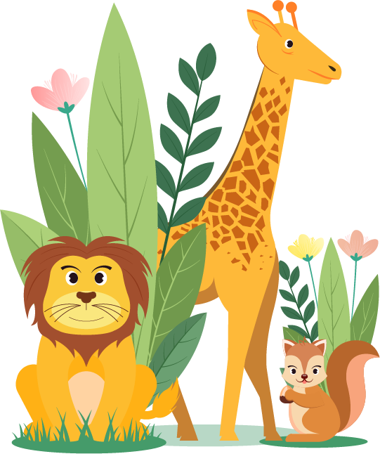 vip1文艺风格节日国际珍稀动物保护日大小草丛中的狮子长颈鹿和松鼠模板