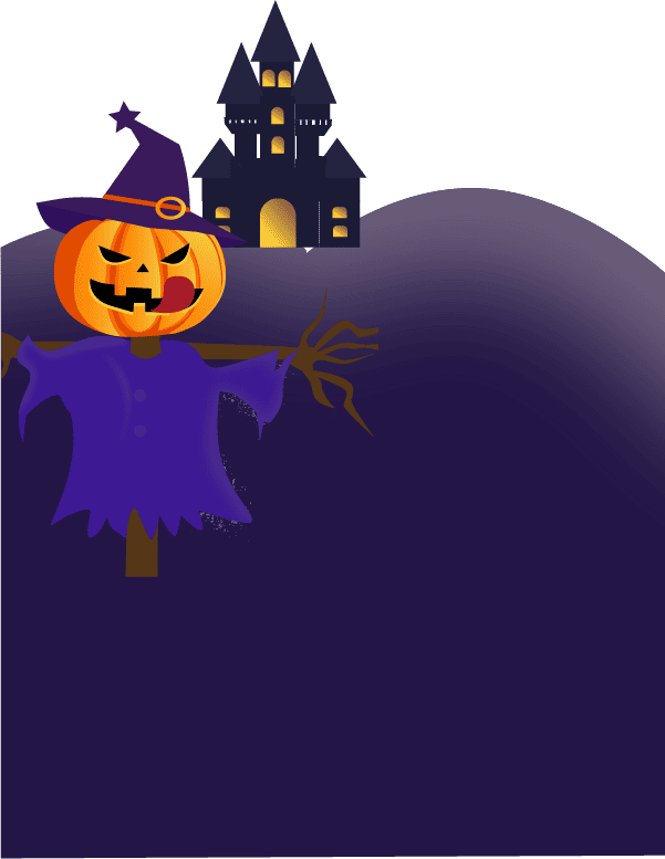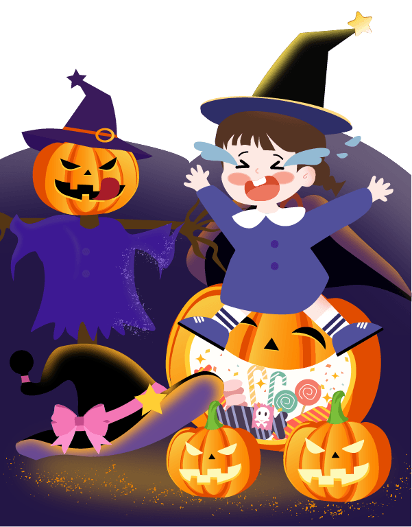 vip2卡通可爱风格节日万圣节前城堡前面的南瓜稻草人和骑着南瓜的小女孩模板
