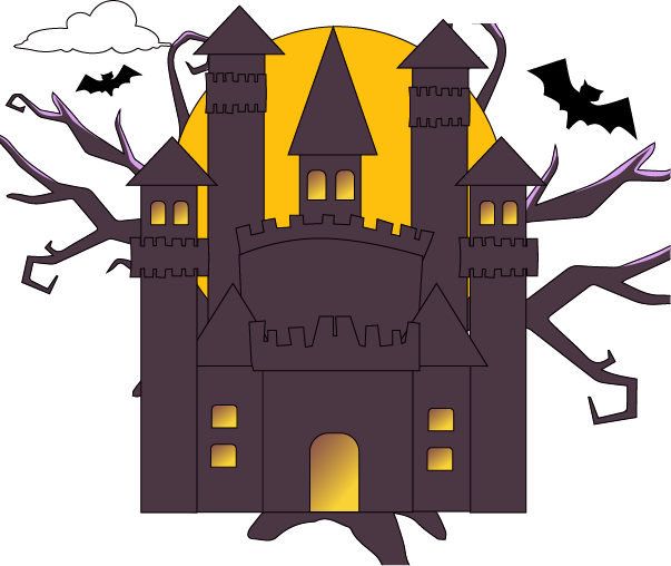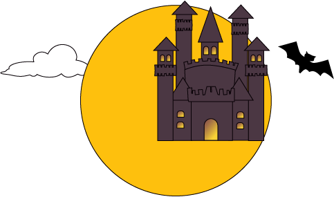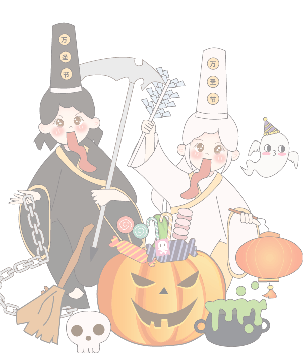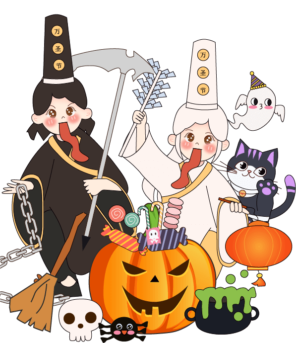vip1卡通可爱风格节日万圣节前夜城堡前面黑白无常和南瓜骷髅头模板