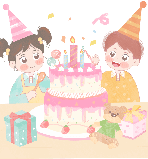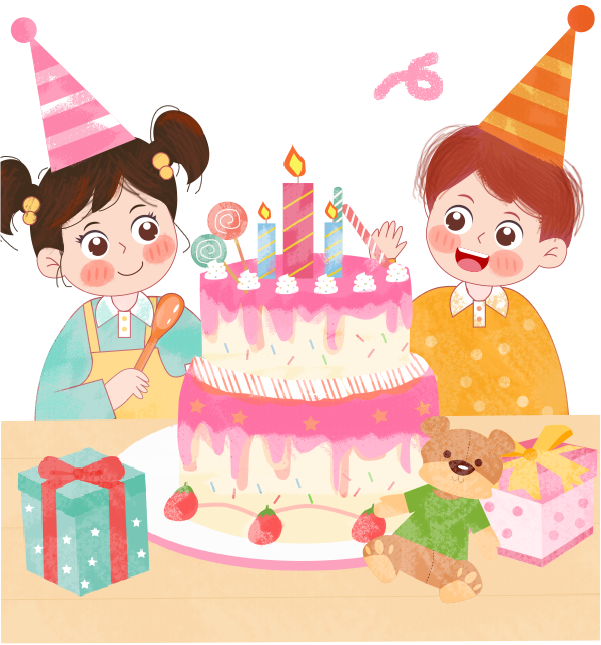 vip2笔刷风格幼儿园10月主题生日会幼儿园带着生日帽男孩女孩和蛋糕模板