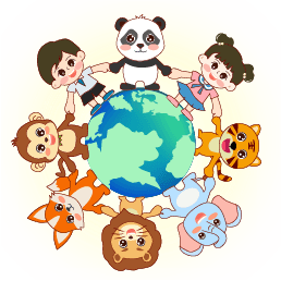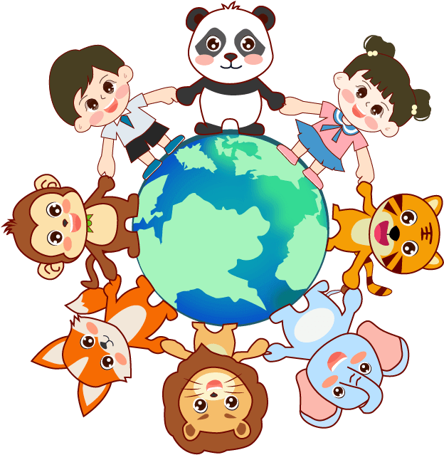 vip1描边卡通可爱风格节日世界动物日地球上面的男孩女孩和动物们手拉手模板