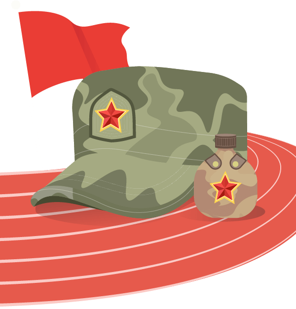 vip2商务风中学新生开学军训迷彩背景上的操场帽子和水壶模板