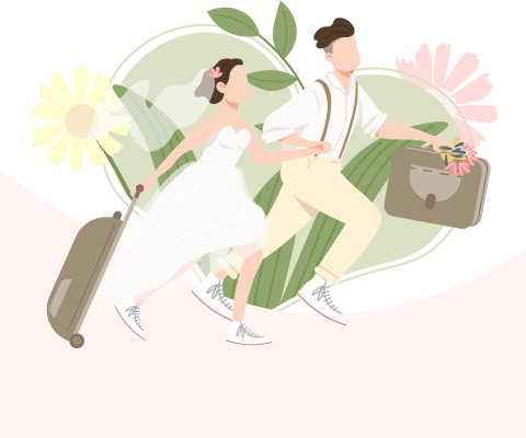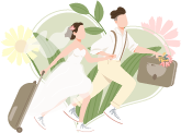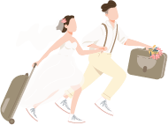 vip2简约浪漫七夕情人节一对身穿婚纱西服的夫妻拿着行李奔跑去旅行模板