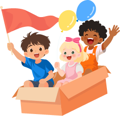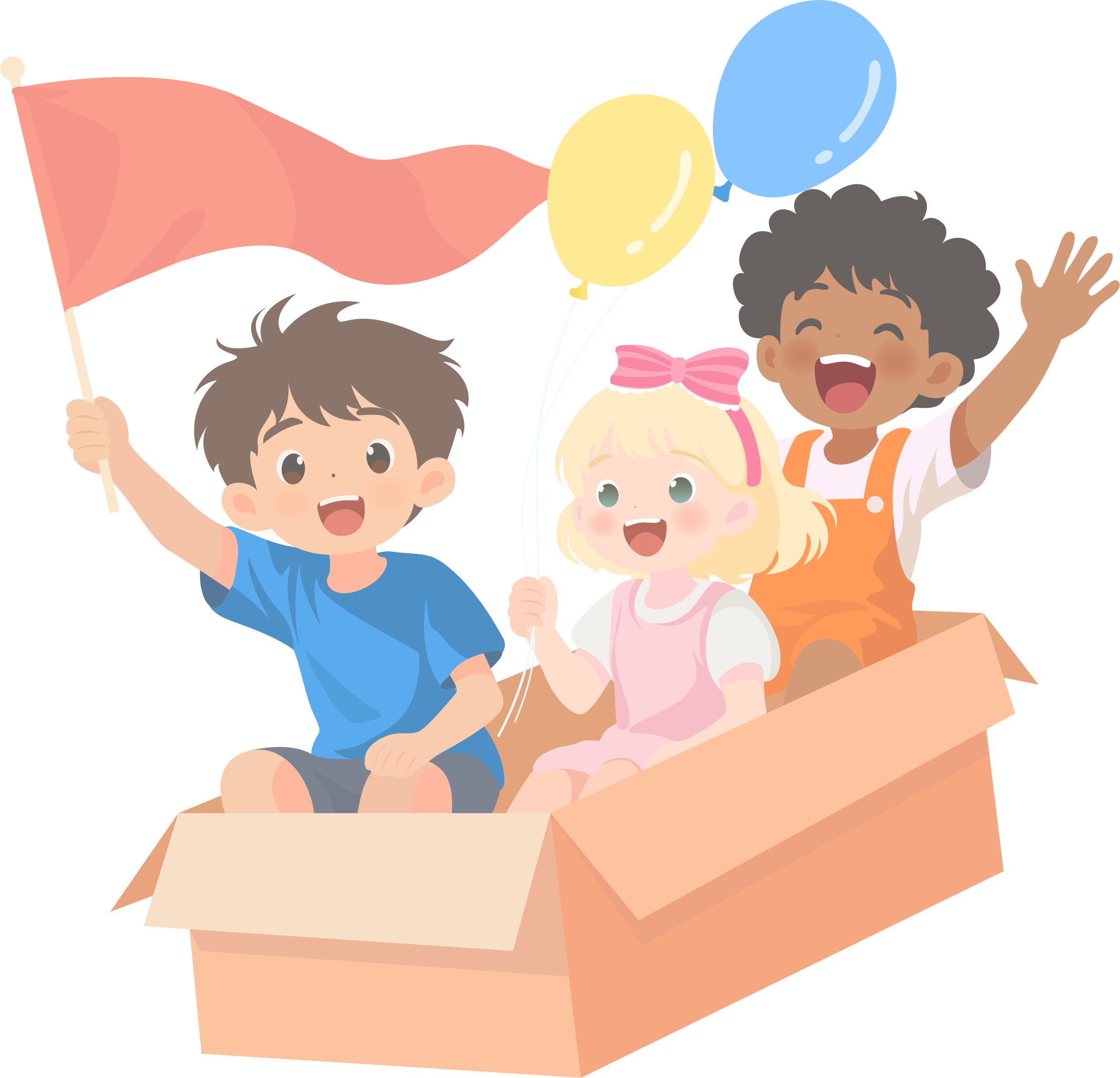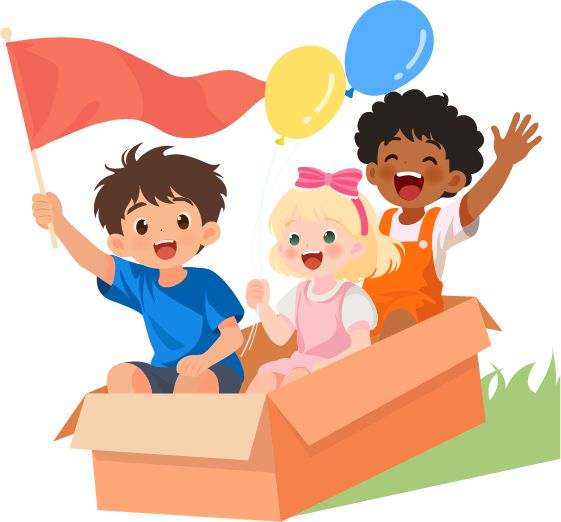 vip1卡通风 世界儿童节 白云向日葵三个小朋友坐在纸箱里在草地上滑行模板