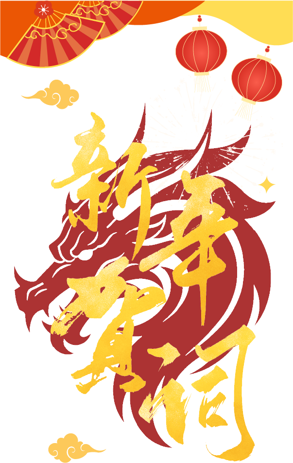 vip1喜庆简约风格新年贺词龙纹背景扇子和灯笼下鎏金色标题模板