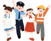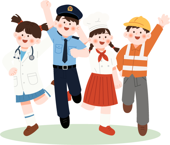 vip1卡通风格小学生暑期职业体验活动纪实职业初体验成长新担当医生警察厨师工人小学生小彩旗蓝天白云草地彩带模板