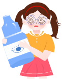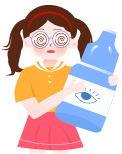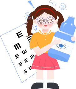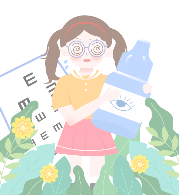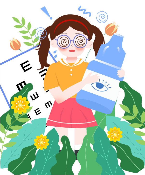 vip1卡通可爱风格幼儿园保护视力知识宣传戴着眼镜近视女孩拿着眼药水前面花草模板