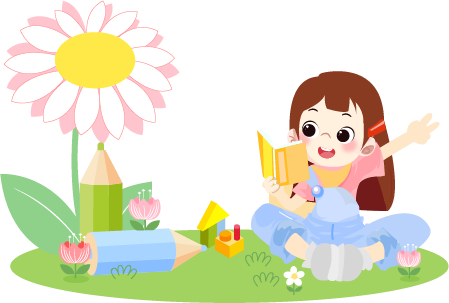 vip1卡通风小学春暖争出彩坐在草坪上看书的女孩巨大粉色花朵模板