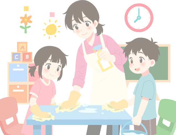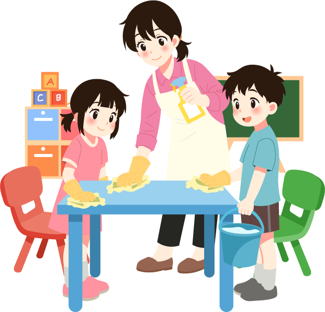 vip1卡通风幼儿园开学前卫生大扫除幼儿园老师和孩子们一起擦桌子小男孩小女孩打扫卫生椅子柜子小黑板时钟纸飞机五角星小彩旗积木清洁剂水桶抹布模板