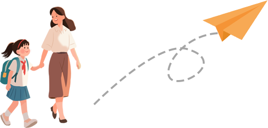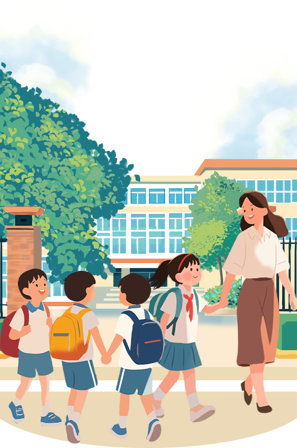 vip1清新插画风、幼小学开学场景、老师带领学生、校门口开学、纸飞机模板