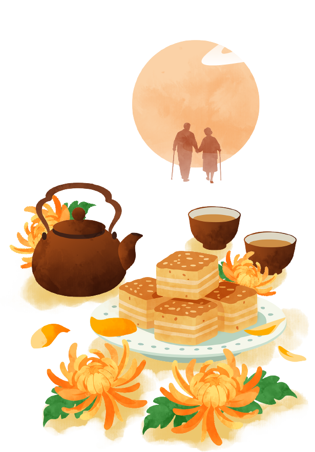 vip1笔刷风重阳节传统节日农历九月初九重阳糕点茶壶茶杯菊花老人剪影夕阳落日太阳模板