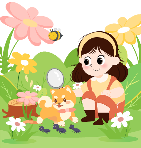 vip1卡通风惊蛰节气主题活动小女孩和小狗一起观察蚂蚁模板
